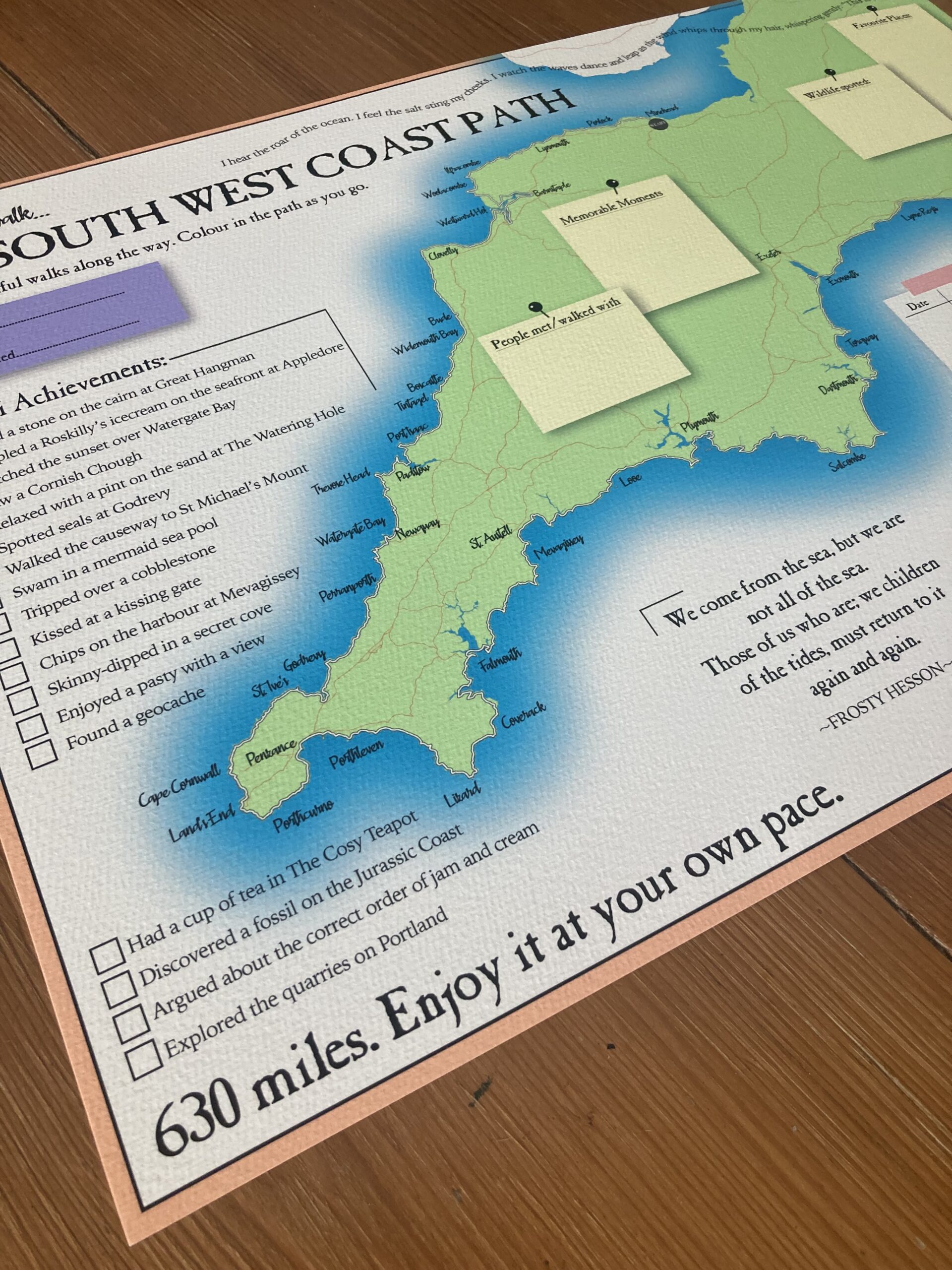 One day I would love to walk the whole thing – the ultimate adventure – but for now, I am enjoying walking it bit by bit. This poster is designed for doing just that. Printed on super-high quality textured card, it details the entire path, with a hollow line that can be coloured as you go. There is space to note down the dates and locations of your walks, as well as places to record special memories and things you spotted along the way. And just for fun, a great little check-list you can mark off as you achieve such milestones as ‘tripped over a cobblestone’, and ‘spotted the seals at Godrevy’.